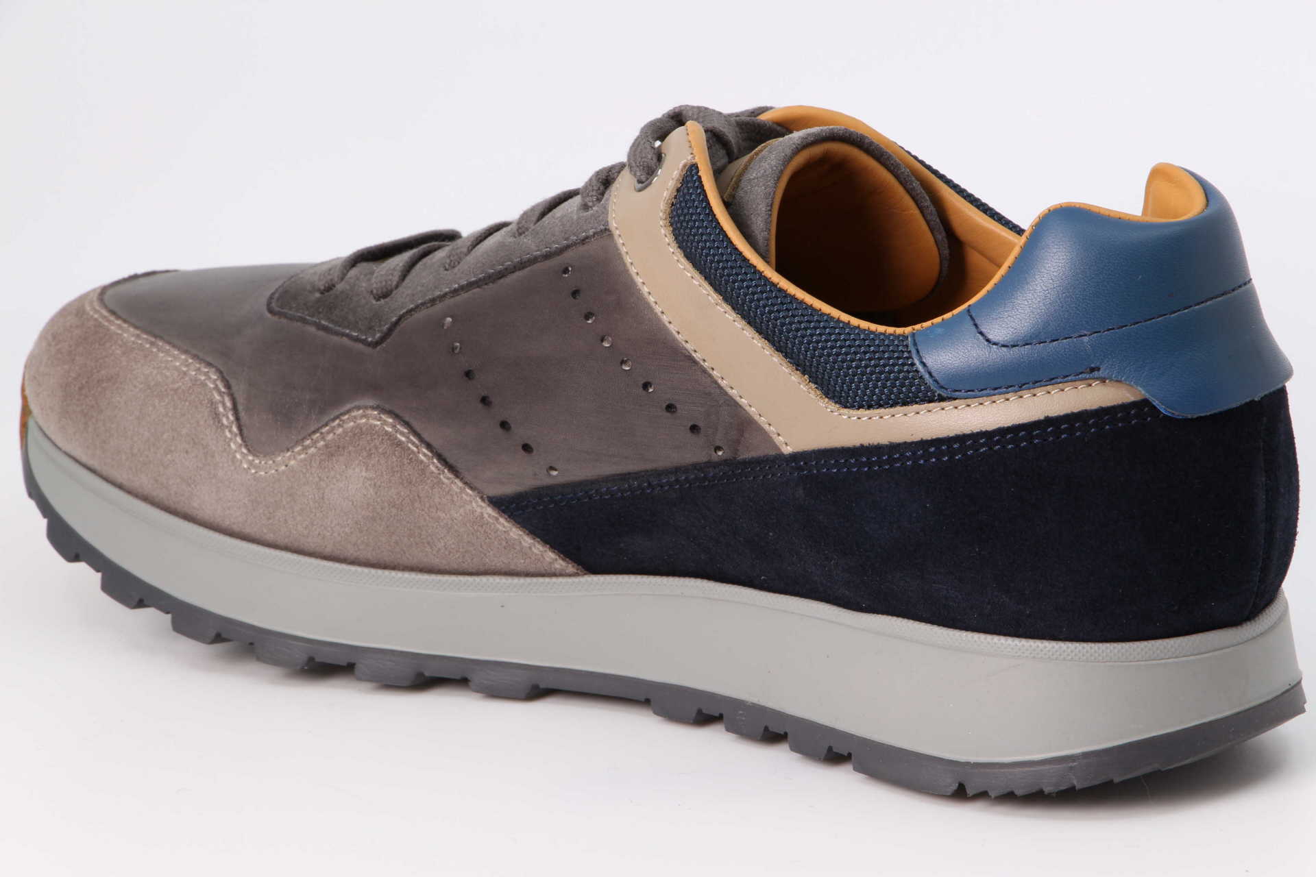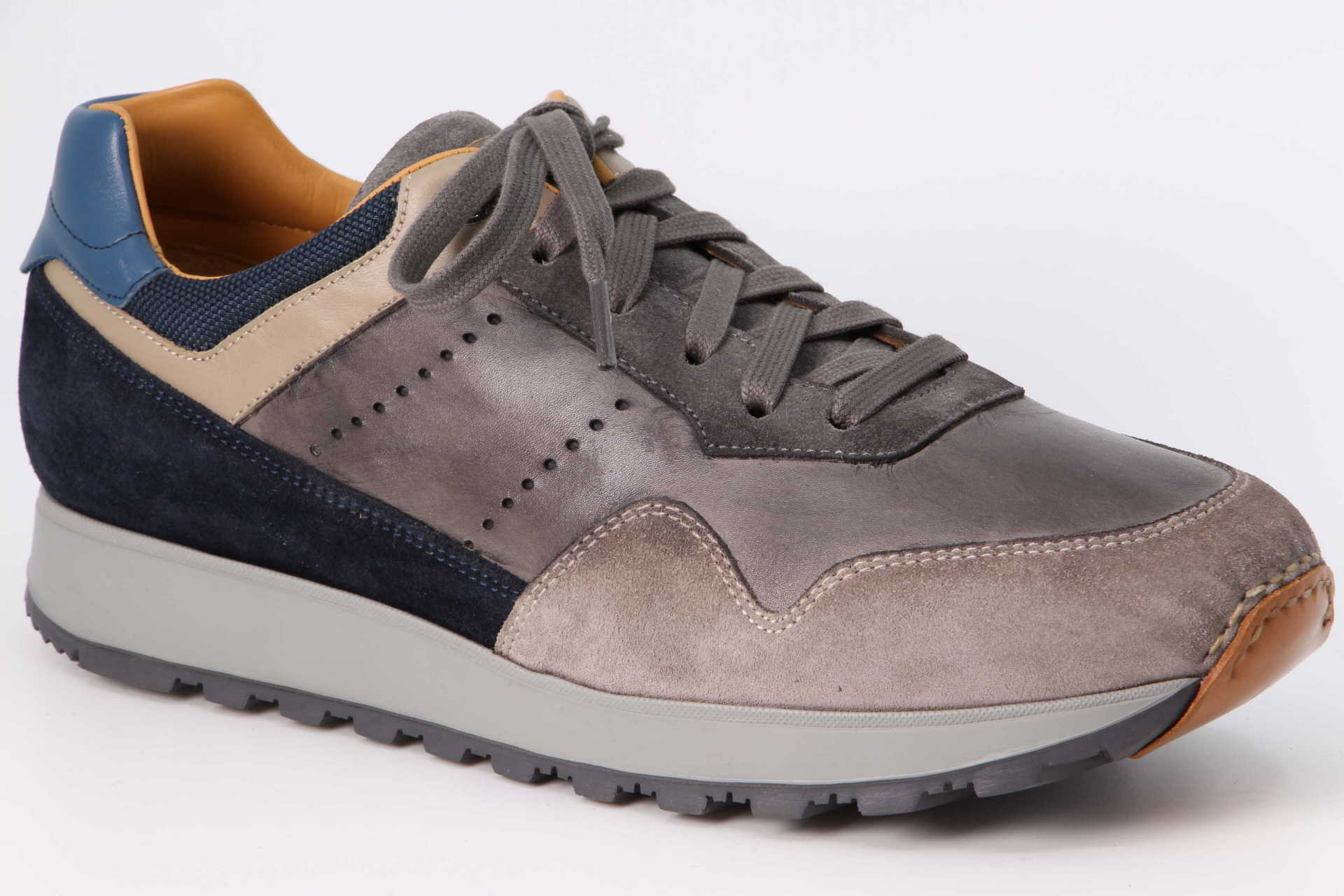 Estrada Grey aus der Retro Runner-Serie bietet Farbblocker aus perforiertem Kalbsleder, Wildleder und modernen Textilien. Die leichte und stossdämpfende Aussensohle wird durch eine handgenähte Lederzehe akzentuiert.