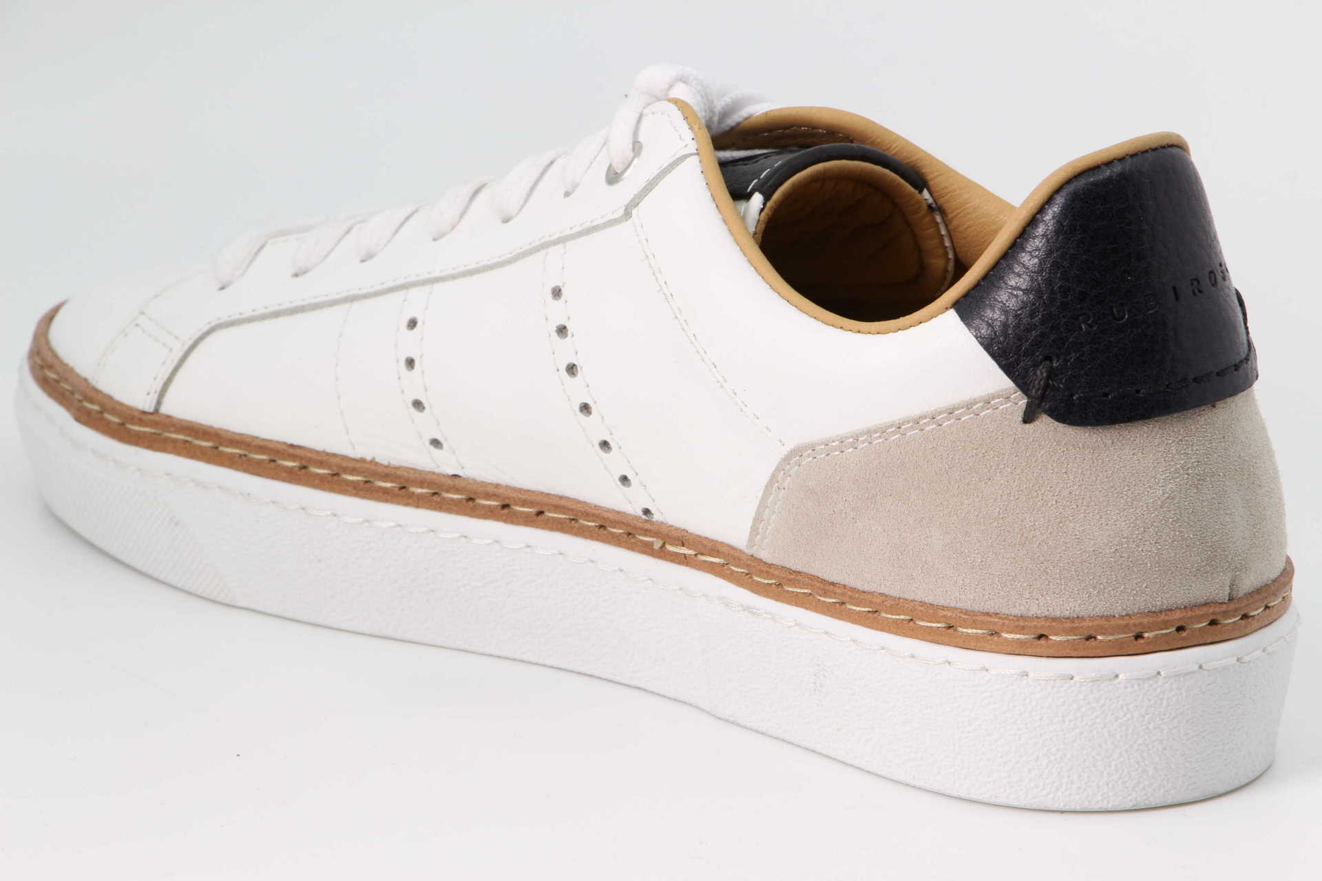 Hergestellt aus einem hochwertigen Kalbs- und Velourleder Mix, verfügt der Oberteil des Schuhs über klassische, perforierte Details «Brogue», die an den bestehenden Stil von RUBIROSA anknüpfen. Der eingesetzte Lederrahmen in der Kautschuksohle unterstreicht die Handwerkskunst im Sneaker.