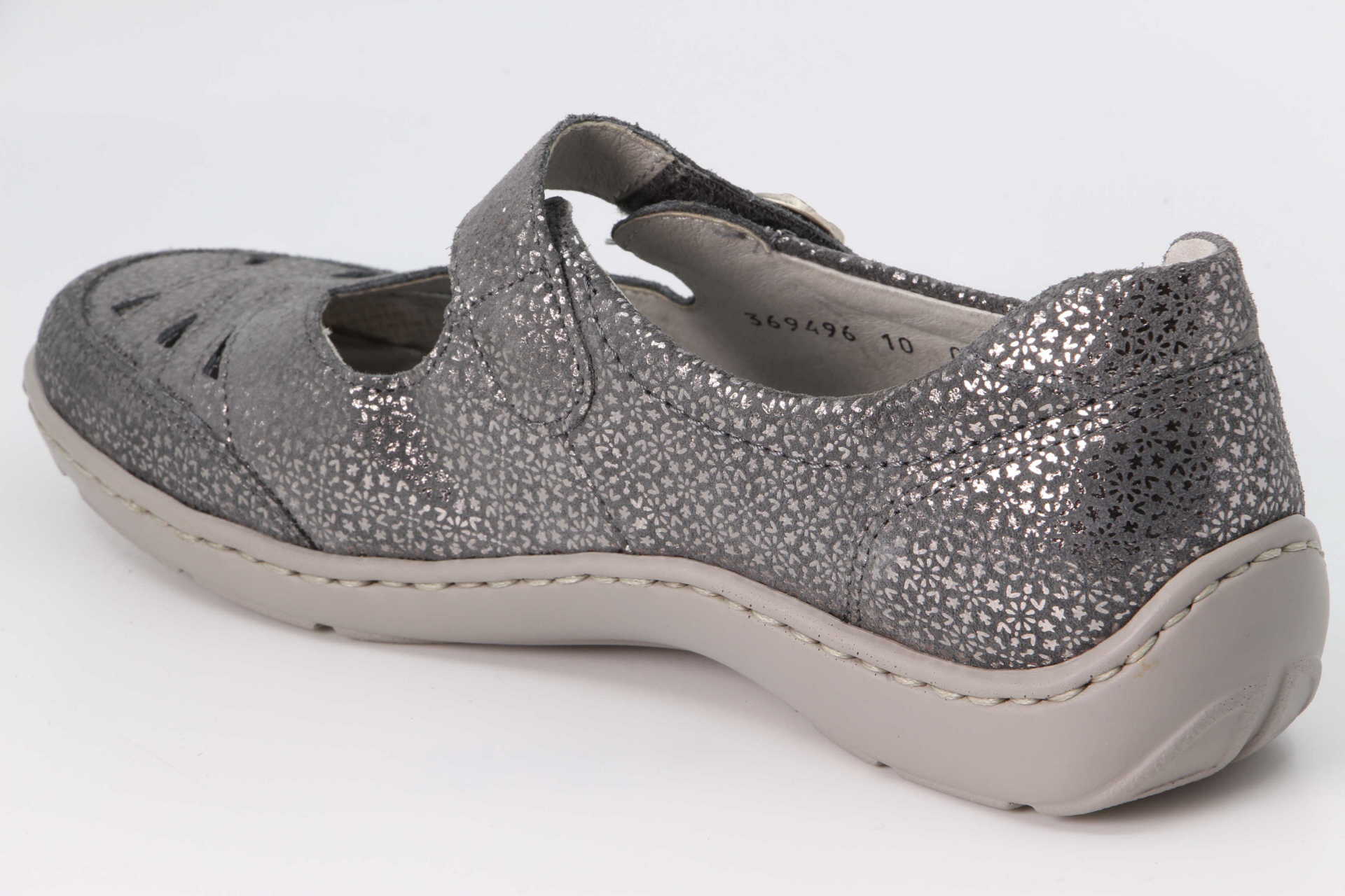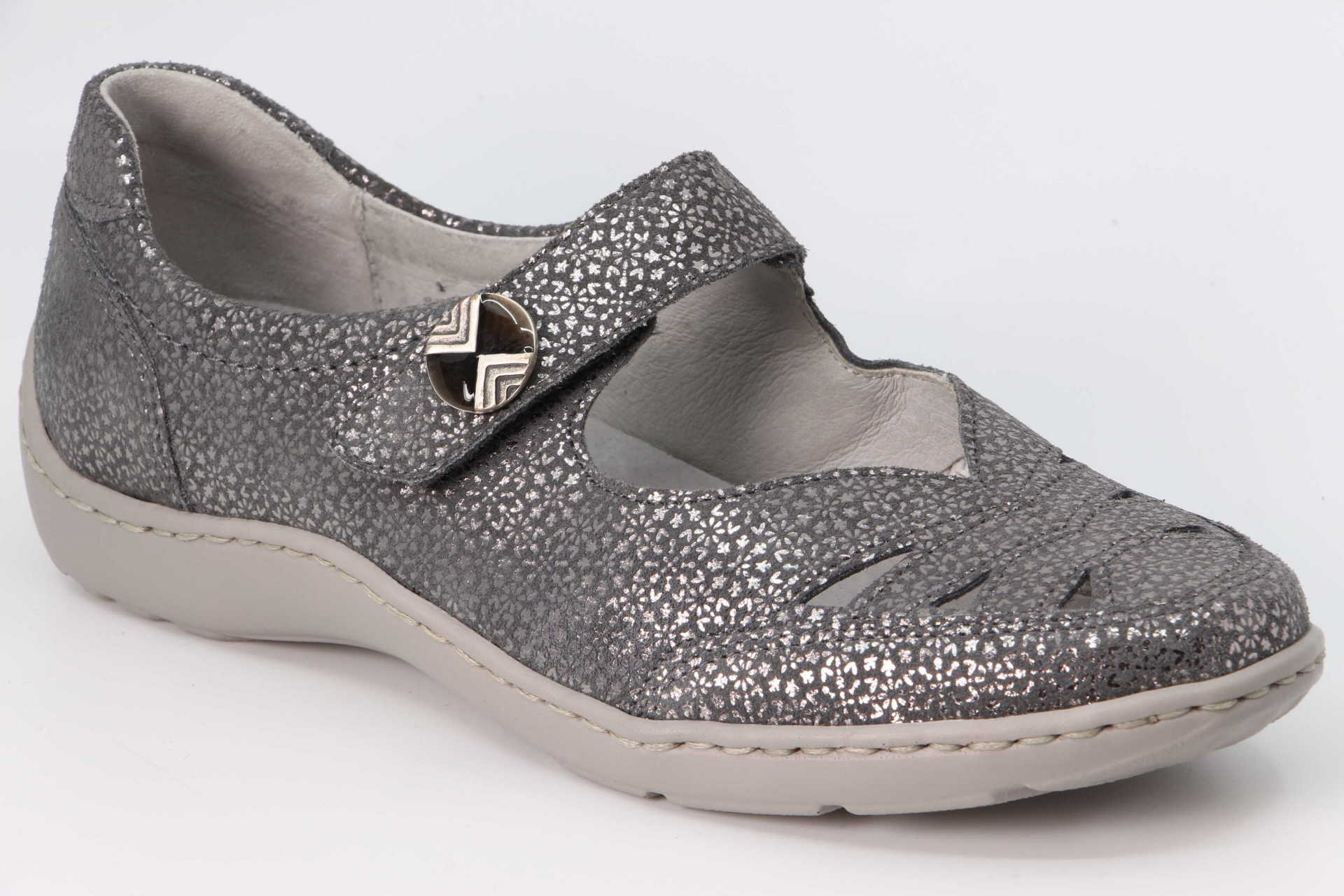 Sommerlicher Chic in nachtblauem Veloursleder mit modischem Musterprint, Luftlöchern und Schmuckknopf. Der Damen-Halbschuh Henni kombiniert seine ansprechende Optik mit besonderem Komfort. Praktisch zum einfachen An- und Ausziehen: der funktionelle Klettverschluss. Ideal für sensible Füsse: die leichte PU-Sohle, das luftgepolsterte Wechselfußbett und die Bequemweite H.