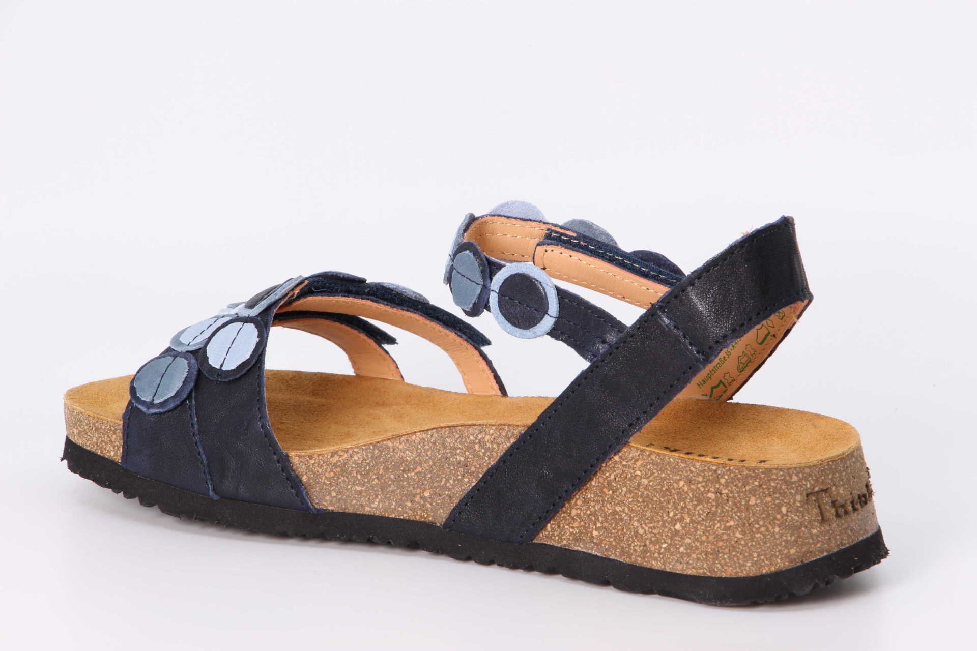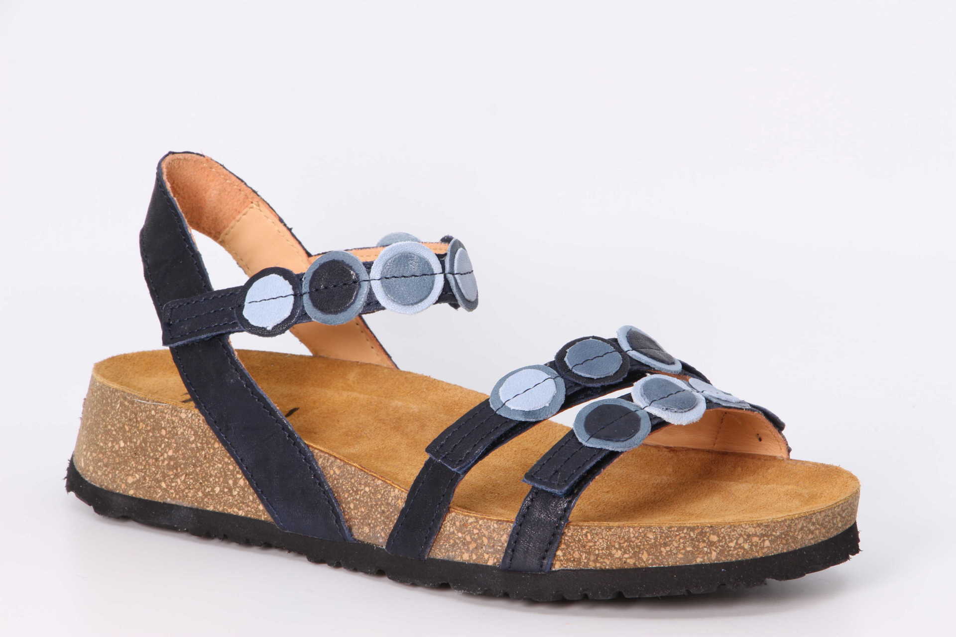 Die Riemchensandale KOAK ist aus besonders anschmiegsamem Leder gefertigt. Dadurch werden Druckstellen vermieden. Die kreisrunden aufgesteppten Effektlederdetails an den Riemen verleihen der Sandale den typischen Think! Look. Die 3 Riemen sind individuell verstellbar – für besten Halt. Das anatomische Korkfussbett sorgt bei KOAK – zusammen mit der weichen Sohle – für ein perfektes Tragegefühl.
