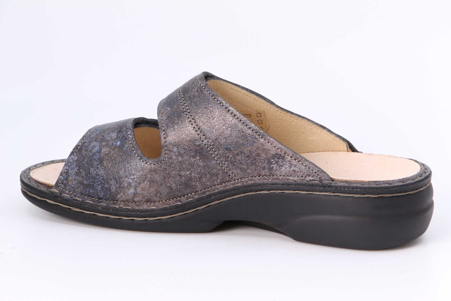 Das klassische Leder-Pantolettenmodell «Sansibar» mit den zwei breiten Klettverschluss-Riemen und der hochwertigen Handnaht ist ein Bequem-Schuh von «FinnComfort», der höchsten Tragekomfort bietet.