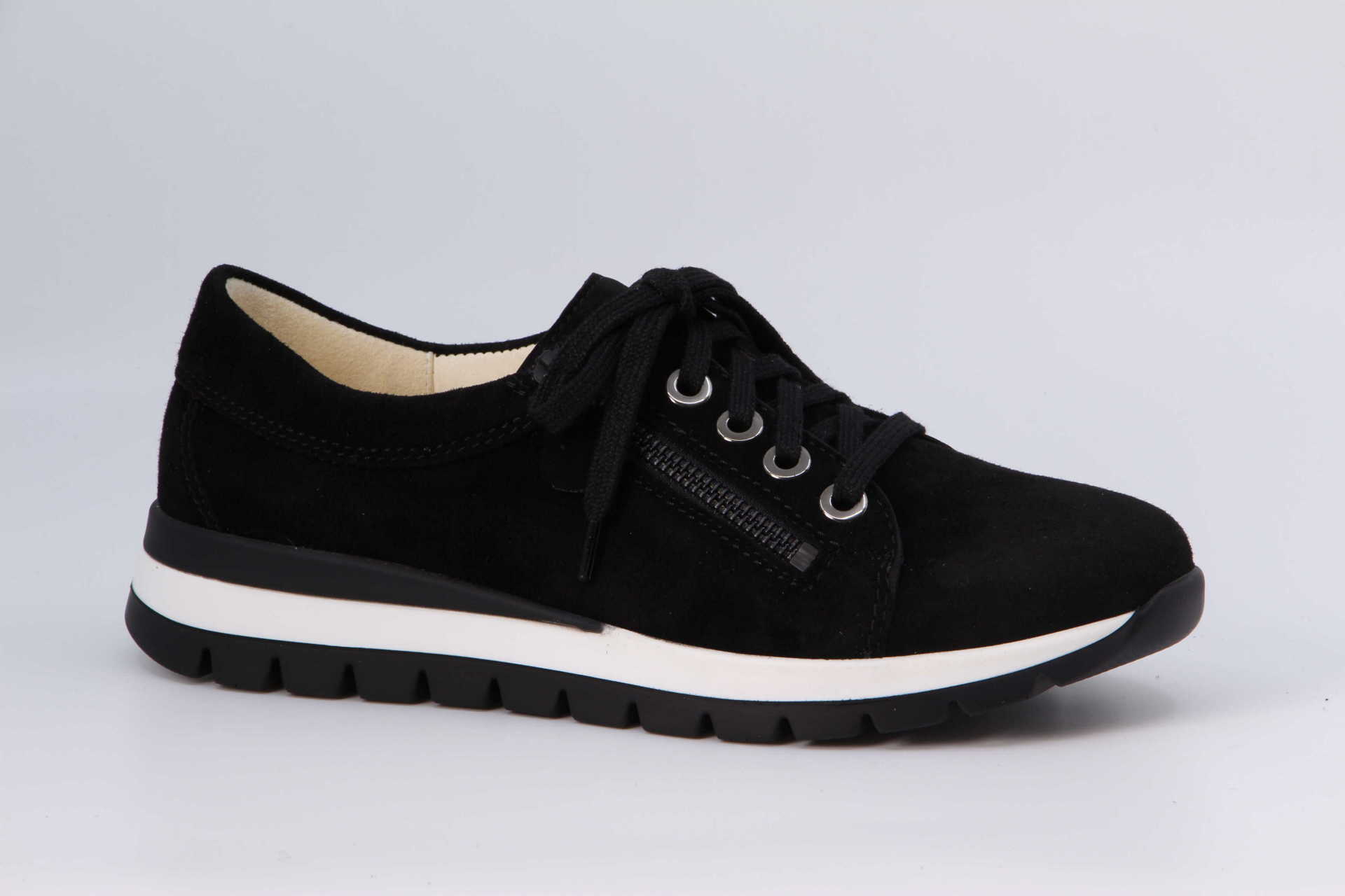 Der moderne Sneaker in trendiger-sportiver Optik aus weichem Samtziegenleder auf der modernen, zweifarbigen SEVILLA-Sohle sorgt für einen stabilen und rutschhemmenden Auftritt durch das markante Sohlenprofil. Durch beide Verschlussmöglichkeiten, nämlich Schnürsenkel in 10 elegant verzierten Ösen und einen praktischen Reissverschluss passt sich dieses Model dem Fuss perfekt an und bieten ihm gleichzeitig einen optimalen Halt. Hier auch wird das natürliche Abrollen des Fusses durch die Flexzone im Vorfussbereich gewährleistet.