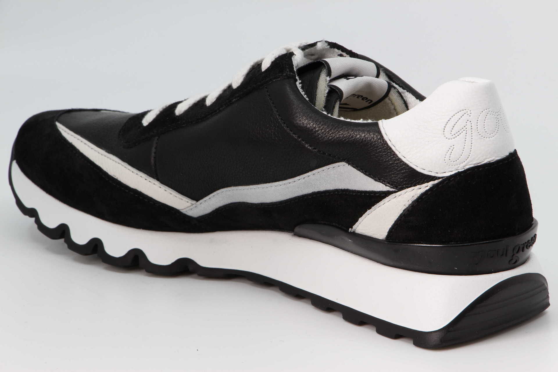 Setzen Sie mit diesen SUPER SOFTEN Sneakers von Paul Green auf einen trendstarken Look. Das Modell präsentiert sich dabei in einer originellen Materialkomposition aus schwarzem Glattleder mit weissen und silber Details. Stilprägend sind dabei die zwei lässigen Laschen, die einen effektvollen Touch vermitteln. Durch die super softe Verarbeitung schmiegt sich das Modell angenehm an den Fuss und das weiche Innenfutter aus Leder mit Frottee sorgt für angenehmes Tragegefühl. Die markante, weisse Sohle mit schwarzen Details rundet das Design gekonnt ab. Gönnen Sie sich mit diesen komfortablen Sneakers ein Upgrade in Ihrer Garderobe! Jeder Paul Green Schuh wird in bis zu 160 Arbeitsschritten von Hand gefertigt und anschliessend geprüft. So wird sichergestellt, dass er den hohen Anforderungen an Passform und Qualität genügt.