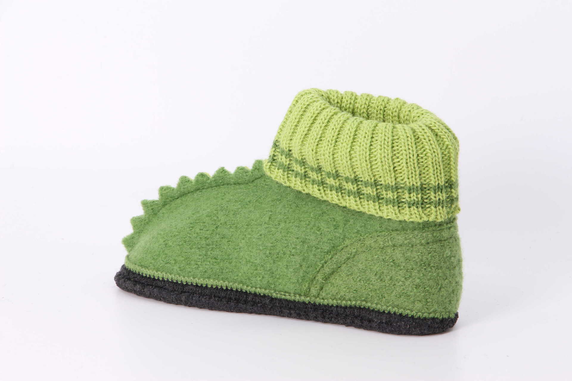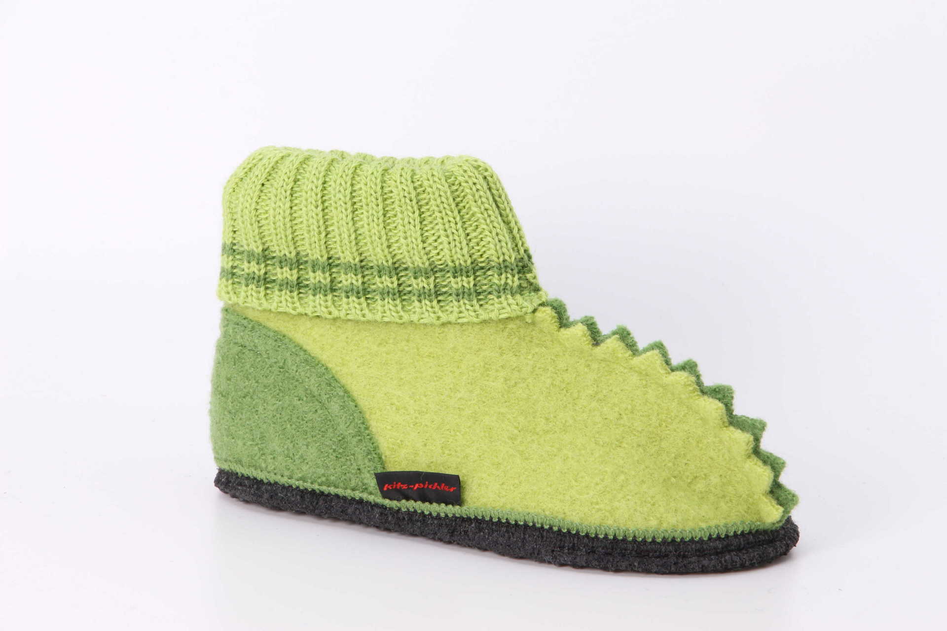 Klassischer Hüttenschuh für Kinder mit kleinen Zacken in knalligen Farben. Gewalkt in reinem Gebirgswasser. 100% reine Schurwolle. Waschbar in der Maschine bei 30 °C.